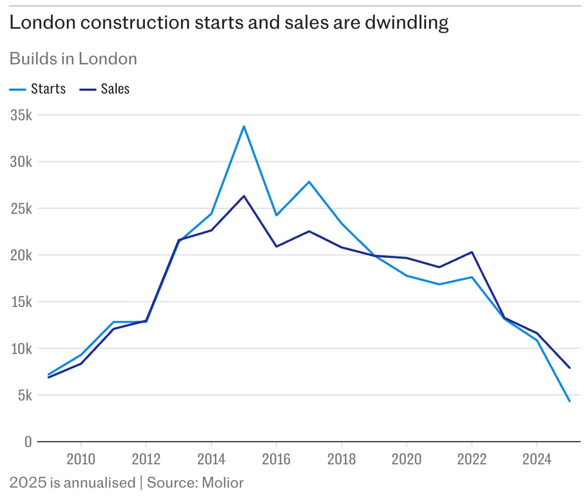That City AM chart: DT now reports London on track for only 15-20k new builds in 2027, compared to 60-65k annually in 2015-20 and the target of 80k p.a. now: https://www.telegraph.co.uk/money/property/buying-selling/developers-padlock-new-builds-london-housebuilding-collapse/ That target is itself extraordinarily unambitious given both that 3.8 mn of the UK's 28.6 mn households are in London, and that the nationwide minimum target to avoid the supply situation deteriorating further is 1.5 mn new builds (over the Parliament). As a (reluctant) Lab voter with buyer's remorse now, I have to say that this is not what the much hearalded 'delivery' looks like :(